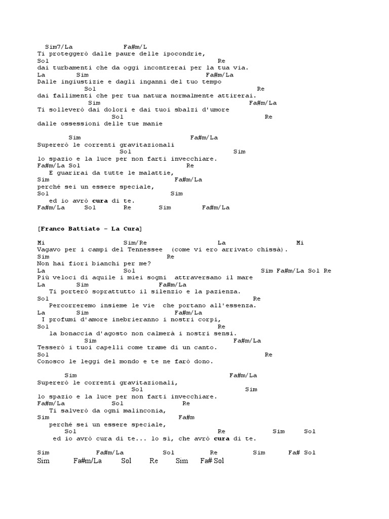 Era da tempo che volevo scrivere un post su questa canzone. Perchè sei un essere speciale ed io avrò cura di te. Sim fa#m/la per non farti invecchiare. Una delle canzoni d'amore per eccellenza! Bel testo del bravissimo battiato, anche se utopistico, magari si riuscisse realmente ad avere cura della persona amata. La cura si trova in 83ª posizione! Falla salire di classifica lasciando un commento o cliccando su mi piace e su +1 qui sotto! Play along with guitar, ukulele, or piano with interactive chords and diagrams. Robbie williams candy lyrics testo. O il nostro autore siciliano non ci capisce nulla di donne e di amore, oppure è evidente che il. Iniziamo con il trascrivere la pagina di sgalambro dalla quale deriva questo testo, consapevoli però del fatto che ne riduce solo in parte l'ellitticità del… Ed io, avrò cura di te. Sol sim fa#m lo spazio e la luce per non farti invecchiare.